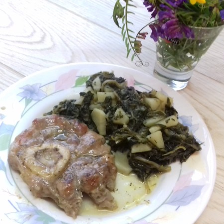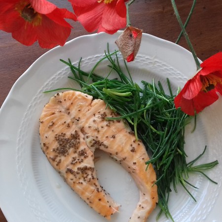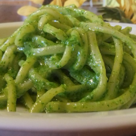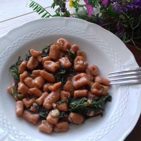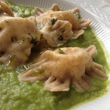 Pasta di fiori di Solina e farro integrale su vellutata di piselli